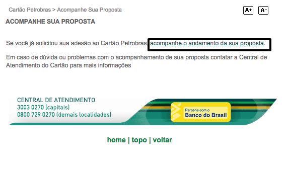 A solicitação pode ser consultada pelo site oficial do cartão www.br.com.br/cartaopetrobras já na página selecione no menu lateral a opção ACOMPANHE SUA PROPOSTA. Este site é o mesmo onde a proposta do cartão de crédito deve ser preenchida. Lembrando que não é necessário ser correntista do BB para obtenção de um cartão.